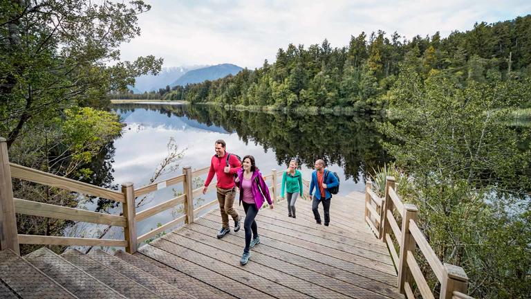 Lake Matheson is nestled in ancient forest and is famous for mirror views of Aoraki/Mount Cook and Mount Tasman. Its excellent reflecting properties are due to the dark brown colour of the water – the result of organic matter leached from the humus of the forest floor. Dawn and dusk are the best times to enjoy the reflections in the lake. Shorter option: Car park to Jetty Viewpoint. Time: 40 min return car park to jetty. Distance: 1 km return car park to jetty.